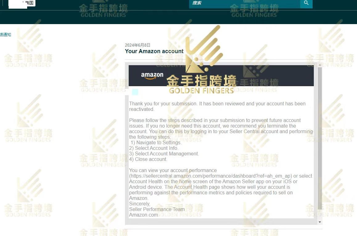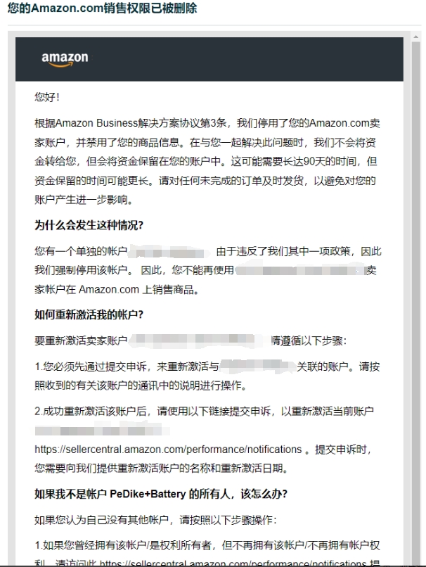 您有一个单独的帐户由于违反了我们其中一项政策,因此我们强制停用该帐户。因此,您不能再使用卖家帐户在Amazon.com上销售商品。(切记合规运营 遵守平台规则)
