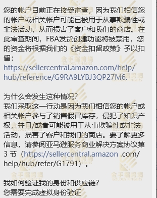 在此审查期间,FBA发货创建功能将被禁用,您的资金将根据我们的《资金扣留政策》予以扣留(切记合规运营 遵守平台规则)